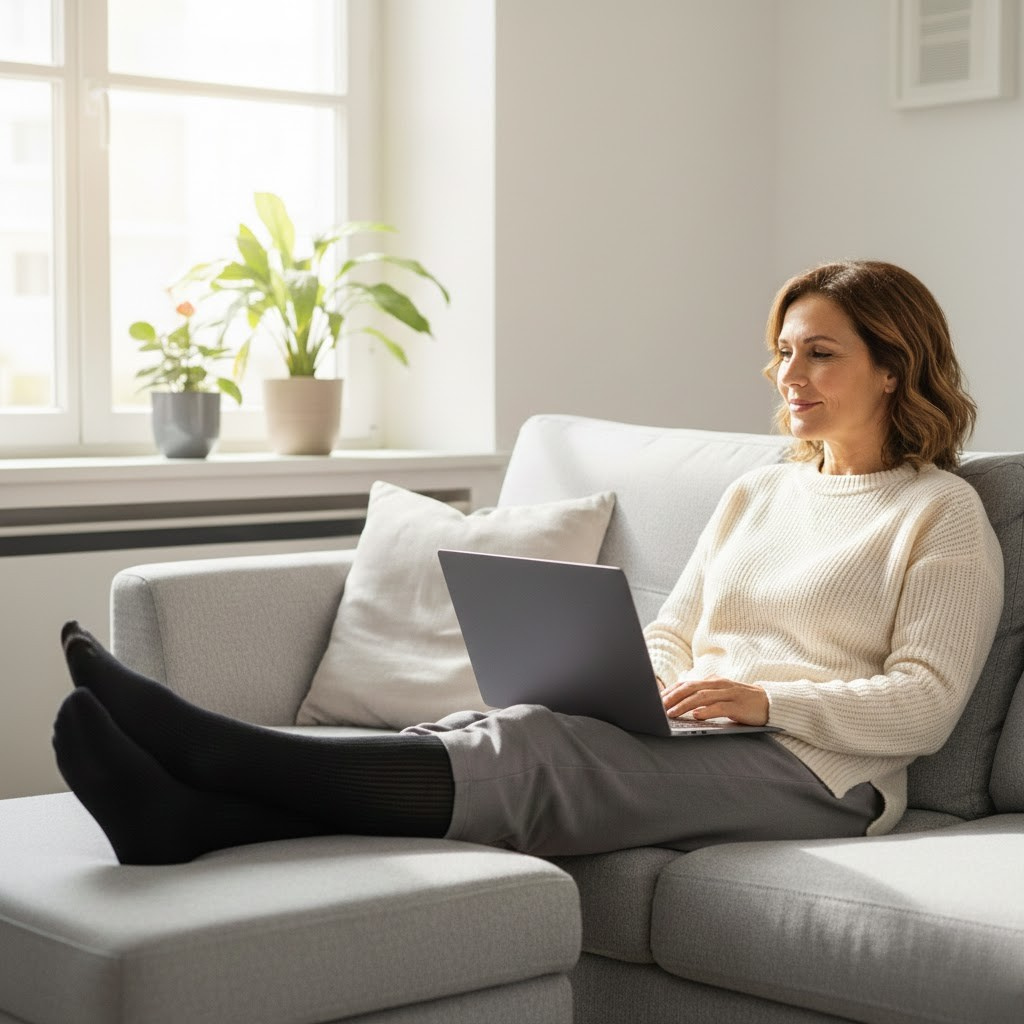 Les chaussettes Pressio exercent une compression graduée qui soutient la circulation et aide à réduire la sensation de jambes lourdes et de gonflements, surtout après de longues heures debout ou assis.